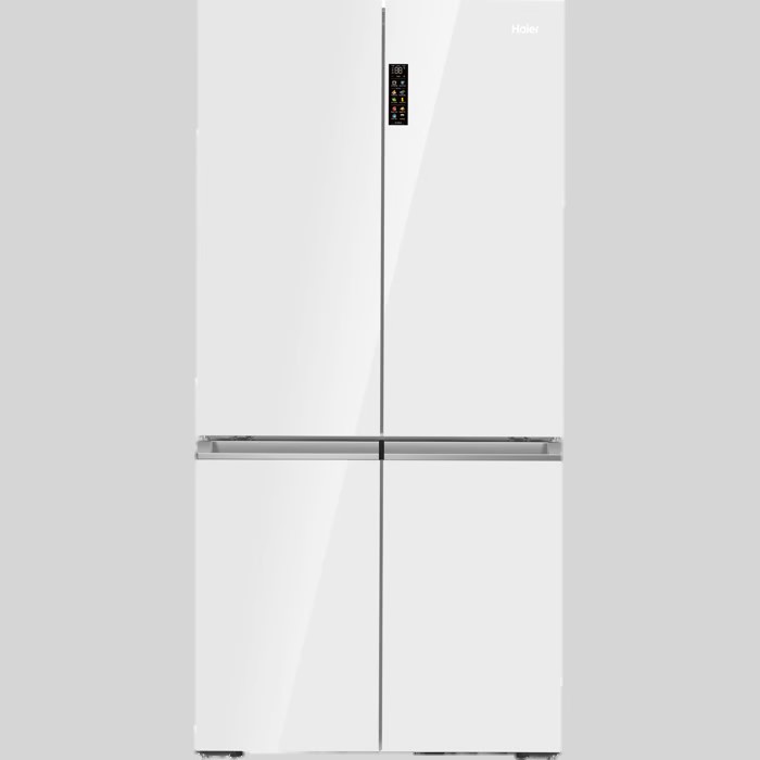 מקרר 4 דלתות מקפיא תחתון 681 ליטר Haier HRF 825FW עם יצרן קרח חשמלי והתקן שבת מובנה – גימור זכוכית לבנה