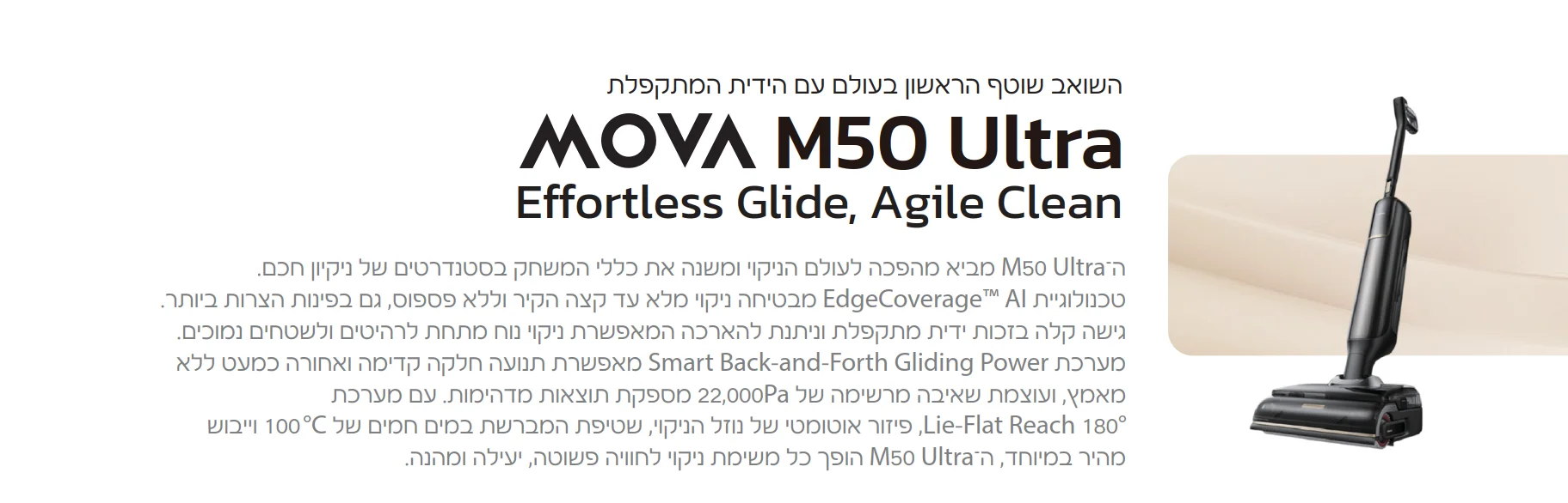 מערכת Smart Back-and-Forth Gliding Power מאפשרת תנועה חלקה קדימה ואחורה כמעט ללא מאמץ, ועוצמת שאיבה מרשימה של 22,000Pa מספקת תוצאות מדהימות. עם מערכת Lie-Flat Reach 180° , פיזור אוטומטי של נוזל הניקוי, שטיפת המברשת במים חמים של 100°C וייבוש מהיר במיוחד, ה־ M50 Ultra הופך כל משימת ניקוי לחוויה פשוטה, יעילה ומהנה.